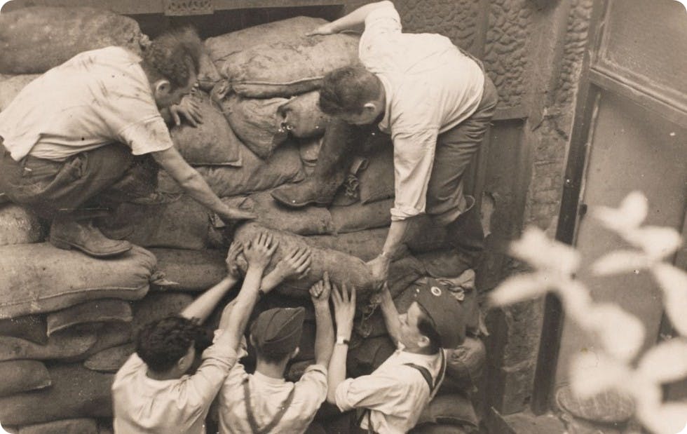 Londoners filling sandbags in preparation for a raid. Image Mary Evans / Heinz Zinram Collection